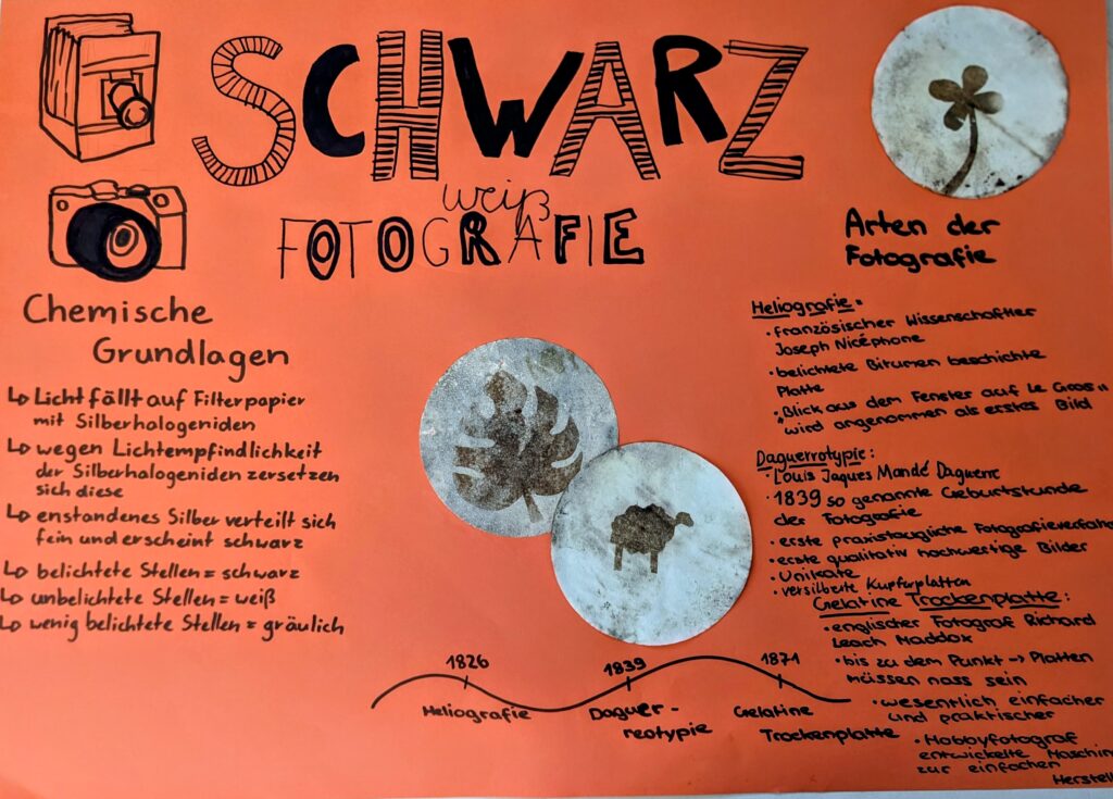 Das Ergebnis: Die Schülerinnen und Schüler entwickelten Negative mit beeindruckenden Motiven, die das Spiel von Licht und Schatten sowie chemisches Verständnis sichtbar machen. Die Plakate wurden sogar auf der Zertifizierungsfeier der Profilschulen für Kulturelle Bildung des Hessischen Kultusministeriums ausgestellt. Ein gelungenes Beispiel dafür, wie Theorie und Praxis in einem ästhetisch reizvollen Experiment vereint werden können.