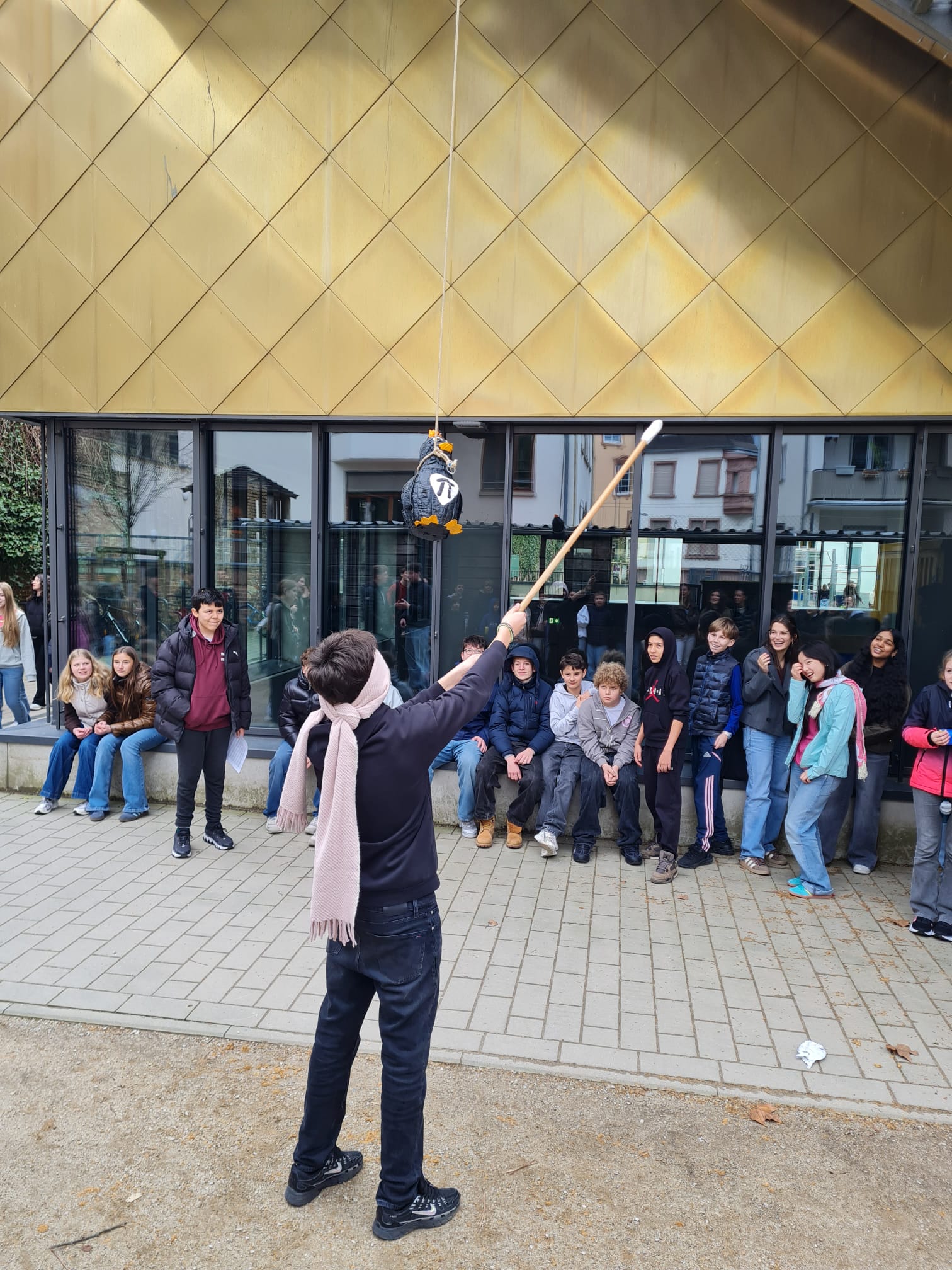 Organisiert wurde die Veranstaltung von den Mathematik-Leistungskursen von Herrn Kuhn (E), Herrn Bock (Q2) und Frau Schneider (Q4). Der Kurs von Herrn Kuhn gestaltete ein vielfältiges Mitmachprogramm: Ein großes π aus Piccolini lud zum Staunen und Schmatzen ein, an einer Wortwand konnten besonders kreative Begriffe mit der Vorsilbe „Pi-“ gesammelt werden, und auf dem Schulhof sorgte ein Suchspiel mit Schnipseln der Pi-Nachkommastellen für Bewegung und Knobelfreude. Als besonderes Highlight wartete eine Piñata in Form eines Pinguins auf mutige Teilnehmende.