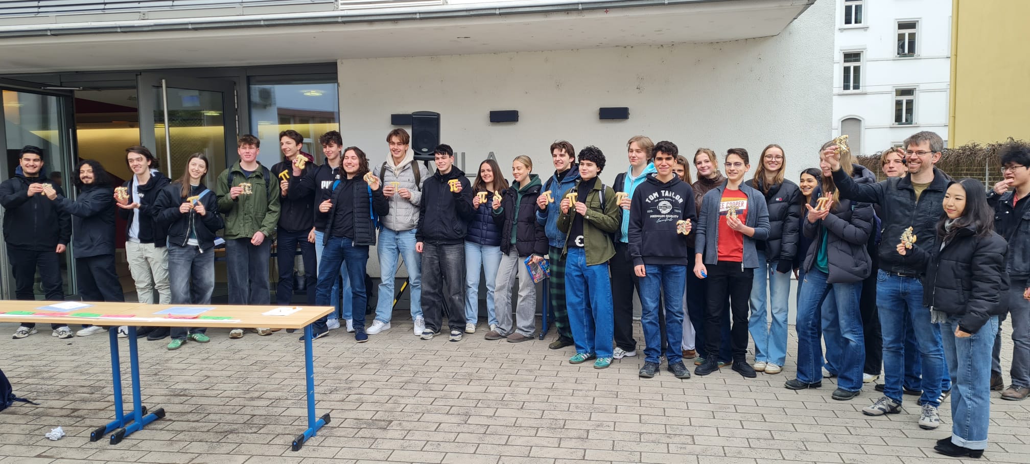 Der Kurs von Herrn Bock organisierte gemeinsam mit dem Kurs von Frau Schneider das alljährliche, beliebte Gedächtnis-Quiz, bei dem Schülerinnen und Schüler möglichst viele Dezimalstellen der Zahl π korrekt aufsagen konnten. Das Leaderboard war im Laufe des Vormittags in stetiger Bewegung – immer neue Bestleistungen wurden erzielt: