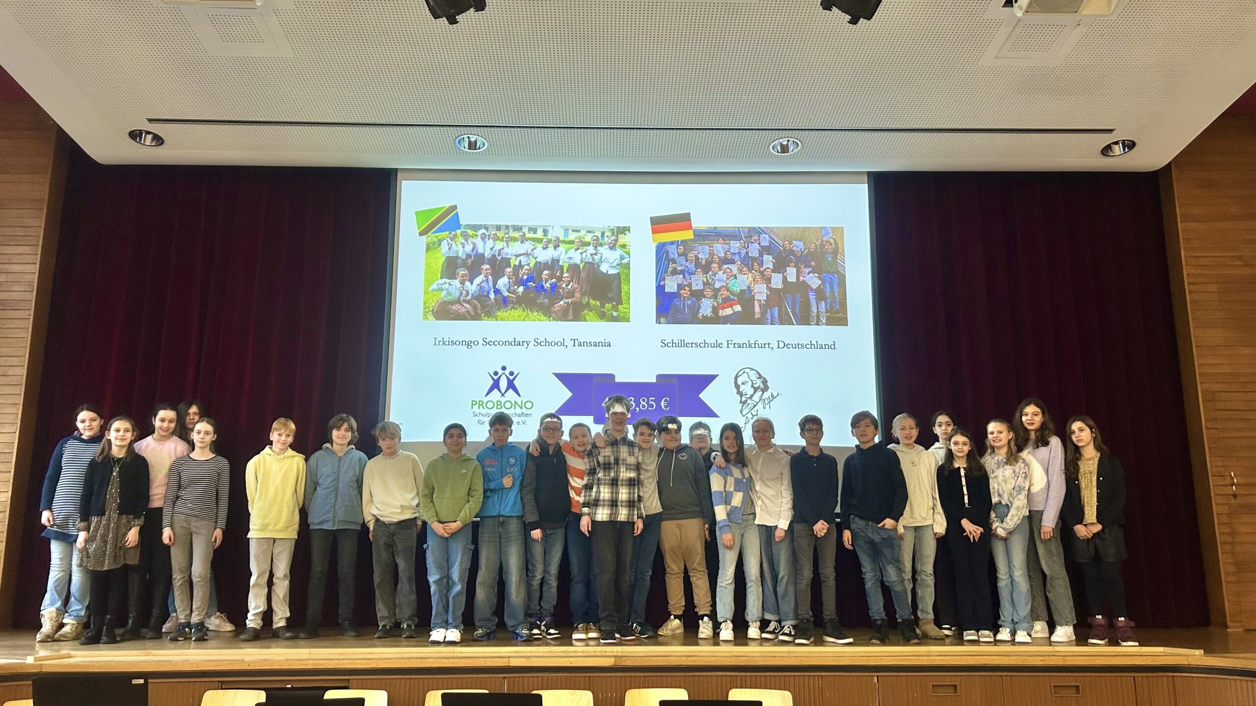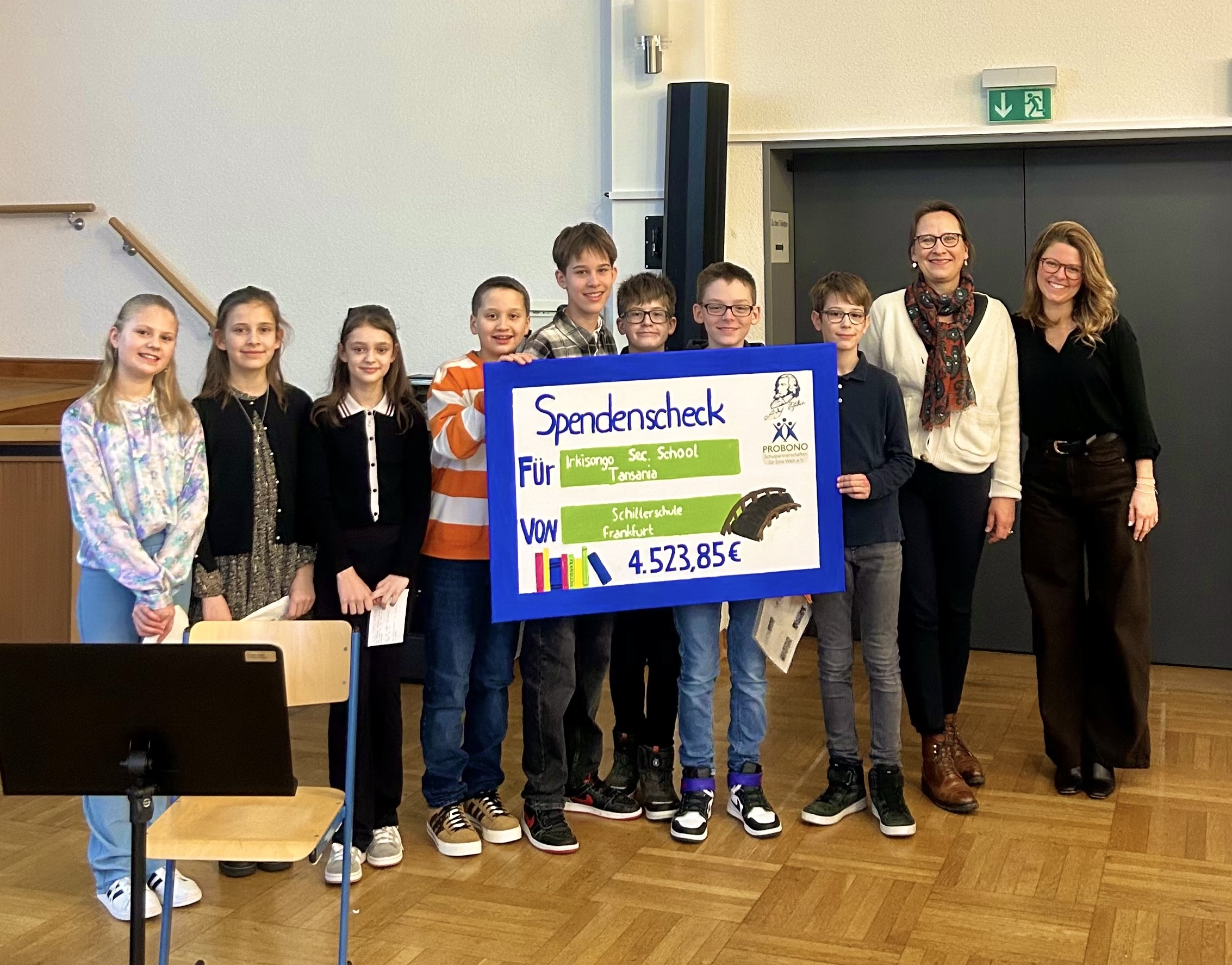 Am Mittwoch fand eine herzliche und bedeutungsvolle Spendenübergabe der Schillerschule statt. Im Rahmen einer feierlichen Veranstaltung überreichten Schülerinnen und Schüler der Klasse 6e im Namen der Schillerschule den Erlös des Weihnachtsmarktes an den Verein PROBONO Schulpartnerschaften für Eine Welt e.V. Der beeindruckende Betrag von 4523,85 € wird dazu beitragen, den Bau von zwei dringend benötigten Brücken an der Irkisongo Secondary School in Tansania zu finanzieren. Diese Brücken sind besonders wichtig, da die bestehenden provisorischen Brücken während der Regenzeit und bei Dunkelheit eine erhebliche Gefahr für die Schülerinnen darstellen. Dank des hohen Betrags, der durch den Weihnachtsmarkt erzielt wurde, können neben dem Brückenbau auch neue Schulbücher für die Irkisongo Secondary School angeschafft werden.